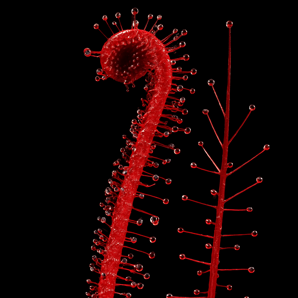Elegant, thread-like leaves; entirely deep red, covered in glistening dew