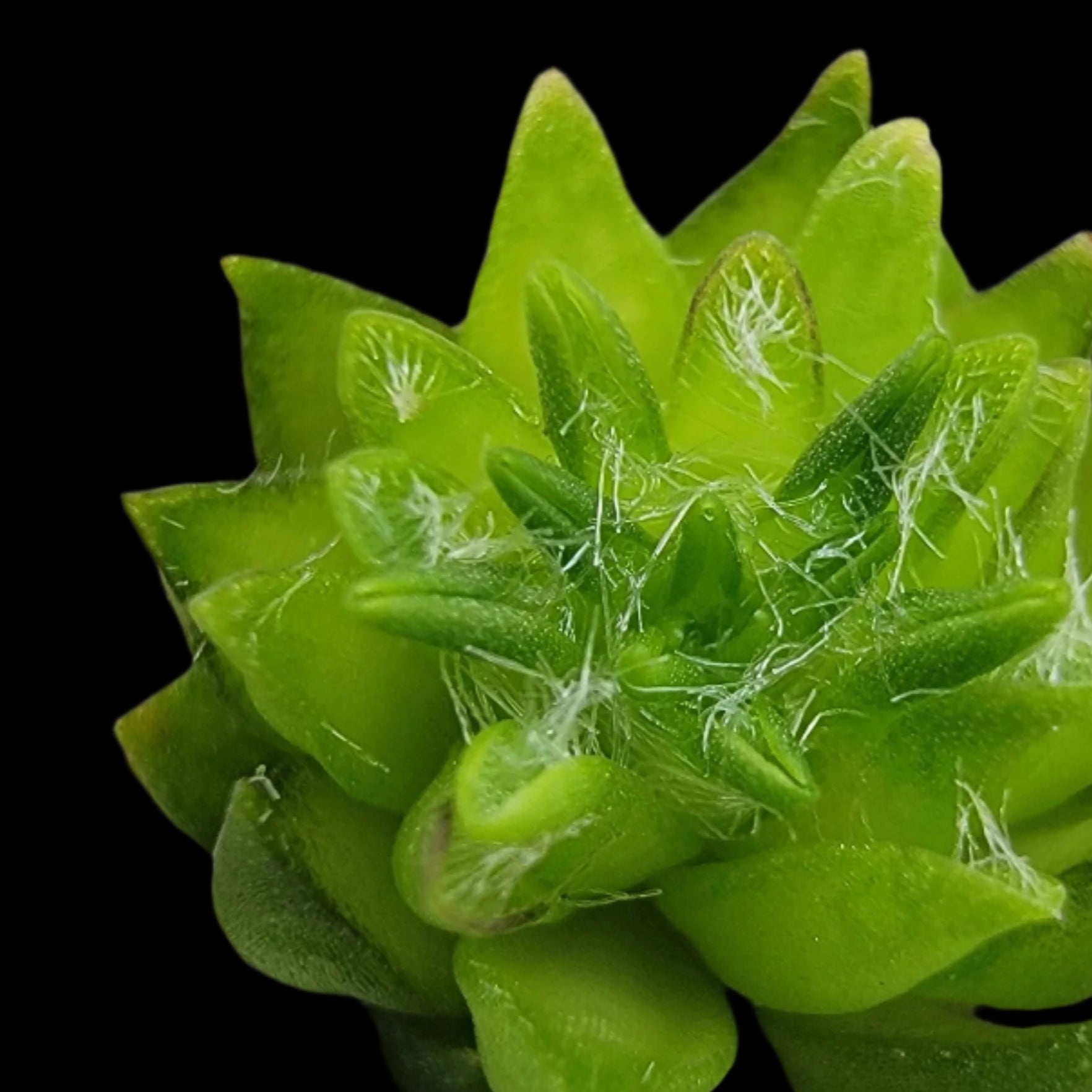 Rosettes of thread-like leaves with powdery coating. Unique texture and pale flowers.