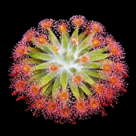 Featuring glistening, dew-like glands that shimmer in the light and trap unsuspecting prey. Native to various regions across the globe, these compact hunters use sticky mucilage to ensnare insects, curling their leaves in a graceful display of motion. Their unique feeding strategy and striking appearance make them a fascinating addition to any plant collection.